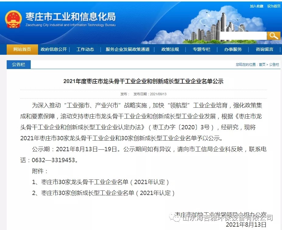 海(hai)吉雅(ya)環保設(she)備(bei)有(you)限公(gong)司被認定爲“2021年度棗(zao)莊市創新(xin)成長型工(gong)業企(qi)業(ye)”